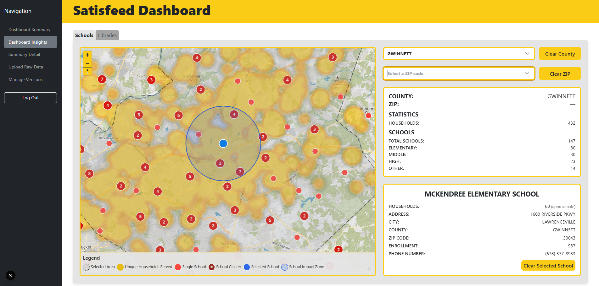 Our team designed and developed an interactive web portal that transforms Satisfeed’s existing data into a clear, actionable analytics dashboard. We integrated distribution data and community resources into a unified map-based interface, giving Satisfeed real-time visibility into food-distribution needs across Gwinnett County. This project was a continuation of Satisfeed: Data Analytics App and developed by the team “Let ‘Em Cook” in Fall 2025, consisting of Dylan Long, Ewura Ama Awere, and Sam Keller.