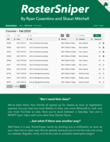 Have you ever found a course which matches your schedule perfectly only to realize it's run out of seats? Say goodbye to checking banner everyday for weeks and hello to Roster Sniper! Our website helps students track courses by sending email notifications once a particular course becomes available. Students are able to create accounts, login and logout, search for and track courses, and manage notifications through our easy to use web application developed with Django. Course data is stored in a MySQL database and is updated periodically by scraping data from banner.